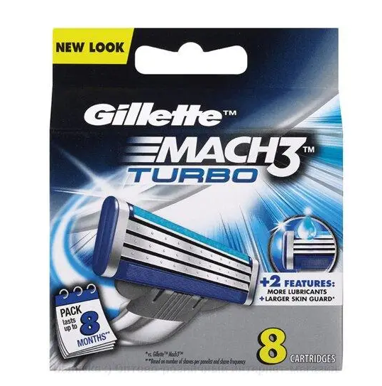 Три тонкі леза Gillette Mach3 Turbo легко ковзають по шкірі, швидко і безслідно видаляючи всі волоски на своєму шляху. Це досягається завдяки особливому алмазоподібному покриттю лез та оптимальній відстані між ними. Особливе розташування лез полегшує їх очищення та промивання після закінчення гоління. Десять мікрогребнів Gillette Mach3 Turbo м'яко розгладжують шкіру і направляють волоски до лез, сприяючи швидшому та якіснішому голінню. Змащувальна смужка містить ще більше гелю, значно полегшуючи процес гоління. Зміна кольору смужки сигналізує про необхідність змінити картридж. Заміна касет проводиться легко та швидко.