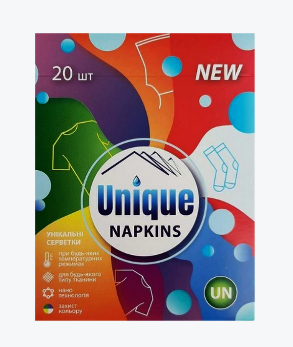 Серветки для прання - захист кольору для кольорових тканин, для спільного прання білої та кольорової білизни, Запобігають випадковому фарбуванню речей, зберігають кольори яскравими. Якщо ви перед пранням помістите серветку UNIQUE в барабан пральної машини, то, діючи як магніт, вона вловлюватиме і притягуватиме до себе частинки фарби та бруду. Для ручного та машинного прання.