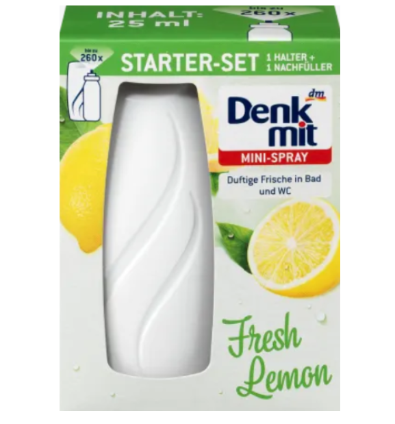 Міні-спрей від Denkmit забезпечує приємну атмосферу затишку у ванній та туалеті завдяки своїй ароматній композиції зі свіжим лимоном.Одного картриджа вистачає приблизно 260 застосувань.Тримач підходить для більшості картриджів, що є у продажу.