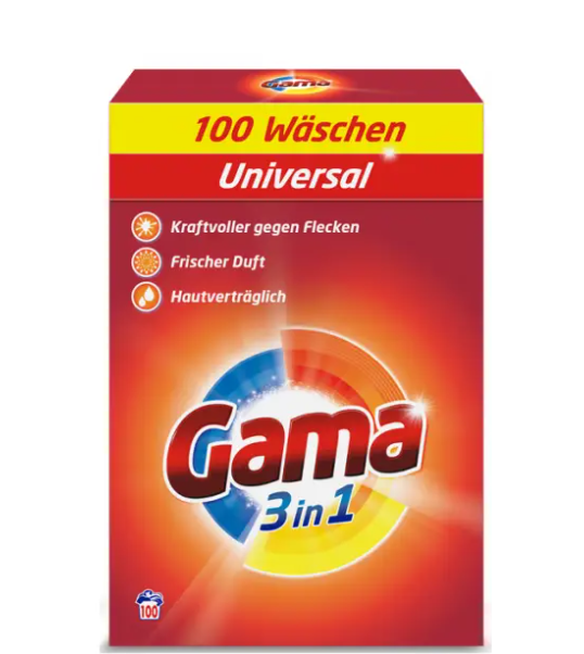 Универсальный немецкий порошок для стирки Gama удалит любые пятна даже в холодной воде, что обеспечит очень бережную стирку вашего белья. Порошок для стирки Gama 6,5кг подходит как для ручной стирки так и для стиральных машин любого типа. Универсальный порошок для стирки Gama полностью растворяется в воде и не оставляет никаких разводов на вашем белье. Специально отобранный состав для стирального порошка Gama теперь способен удалить любые пятна жира, а также пятна от растений, вина, кофе, крови, чая и придает вашей одежде просто неповторимый аромат.