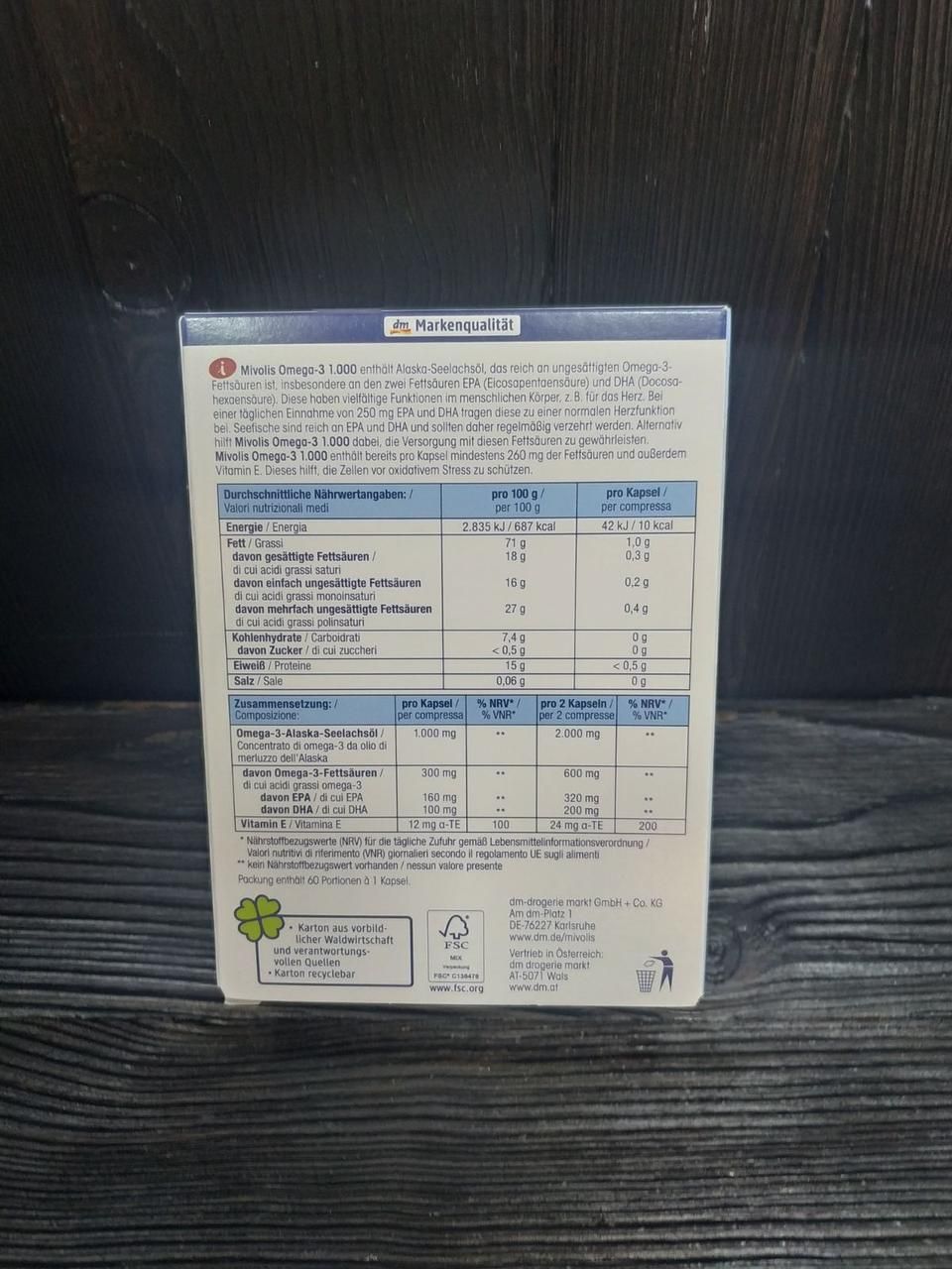 Mivolis Omega-3 1000 содержит масло минтая Alsaka, которое богато ненасыщенными жирными кислотами омега-3, особенно двумя незаменимыми жирными кислотами EPA (эйкозапентаеновая кислота) и DHA (докозагексаеновая кислота). Они выполняют множество функций в организме человека, например Б. для сердца. Морская рыба особенно богата ЭПК и ДГК, поэтому ее следует употреблять регулярно. Кроме того, Mivolis Omega-3 1000 помогает обеспечить поступление этих жирных кислот. При ежедневном приеме 250 мг EPA и DHA они способствуют нормальной работе сердца. Mivolis Omega-3 1000 уже содержит не менее 260 мг жирных кислот, а также витамин Е. Это помогает защитить клетки от окислительного стресса.
